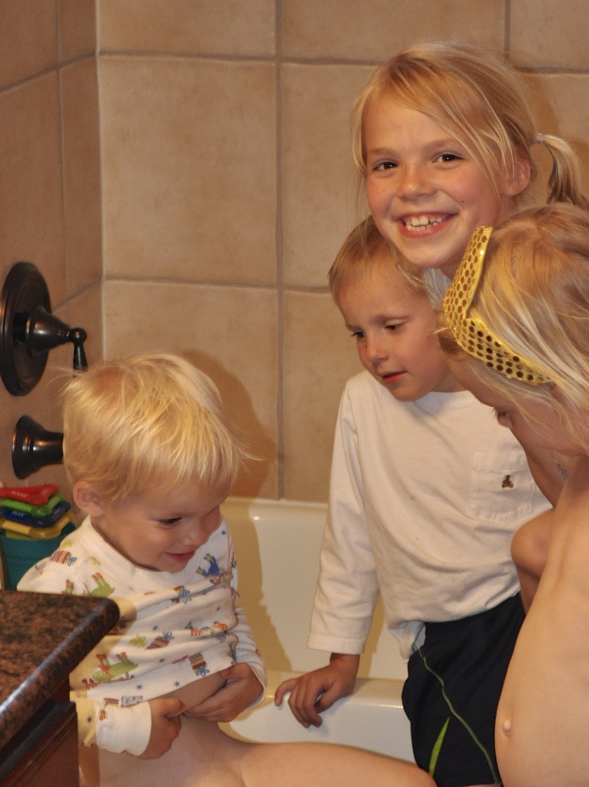 For the record, he did not pee. Not even once. This means the older siblings’ enthusiasm will wane quickly. They are not a patient bunch. This is best shown by Nate’s posture in the picture. Clearly they are telling him to “Hurry up! GO POTTYYYYYYY!”