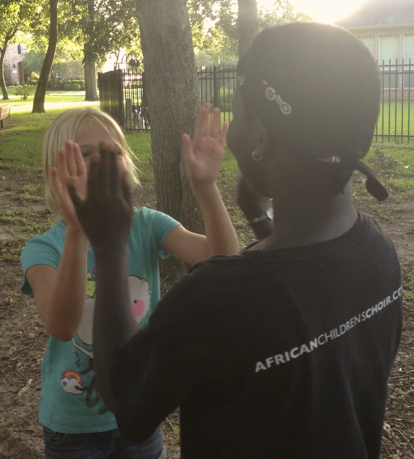 My kids love their simple African games, the toys they make from sticks and leaves, their faces when they taste honeysuckle, and their questions about why we keep such a large dog in our house. (Lots of questions about our Greyhound. Of everything, keeping such a big dog in our house is the most troublesome to Nina and Patience.) Seriously. Our kids cannot get enough of these wonderful kids.
