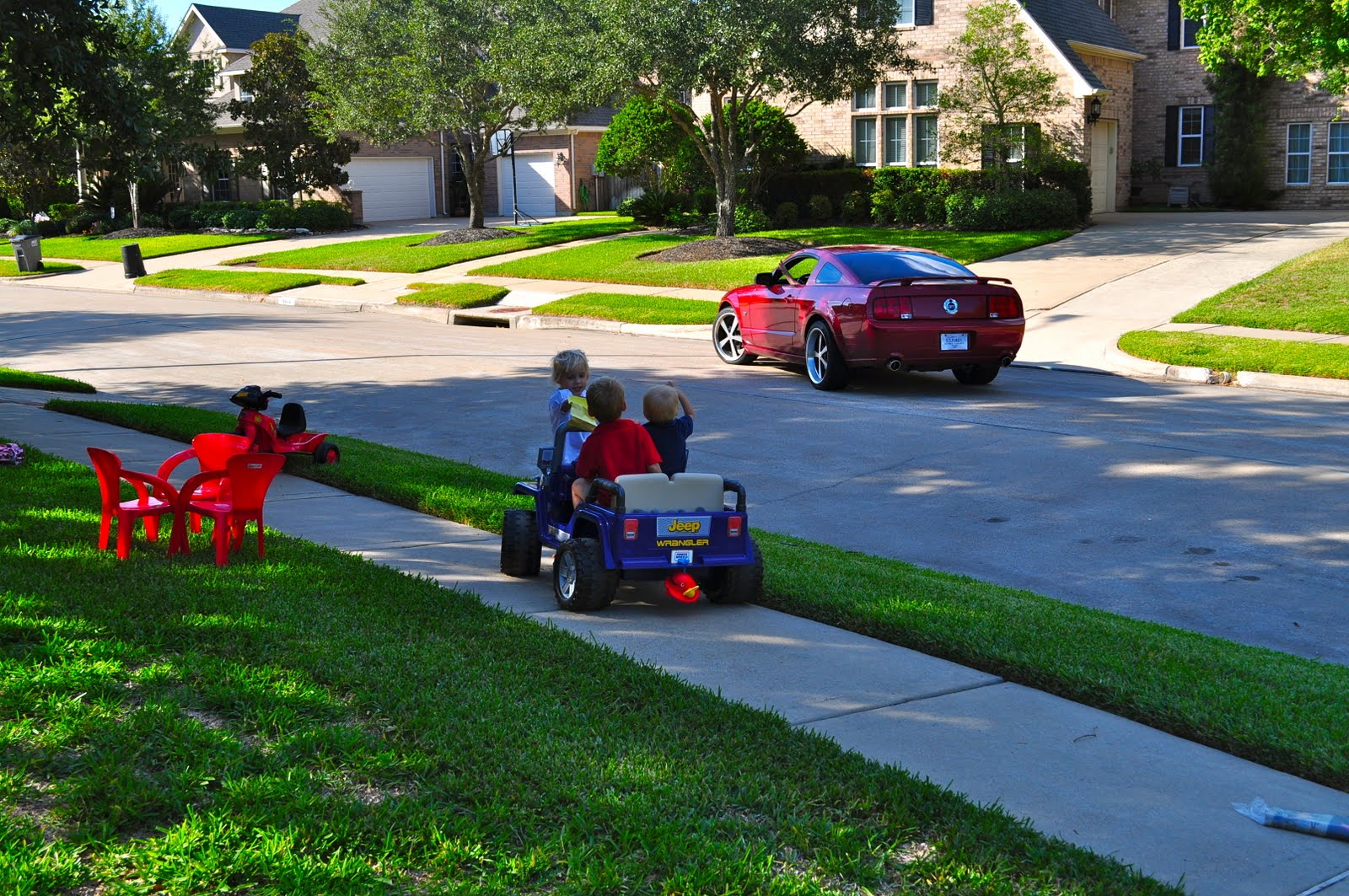 My boys are in awe of this toy, with its dual exhausts that make a lot of (unnecessary) noise. They sit in their Jeep, Sam in the driver’s seat, both making that vroom! vroom! boy noise. They wave fiercely at the neighbor boy (see Nate’s raised hand in the picture)–nice kid that he is, he waves back at them. They play with the dials and buttons on the Jeep, trying to make the same Mustang noises.