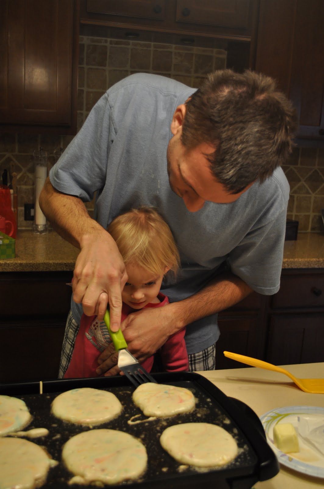 …Logic. Yes, M. is using Ellie’s brand new Christmas flipper to make the pancakes. I don’t think I need to tell you that making pancakes for a family of six is easier when one does not allow a three-year-old close to the sputtering griddle. But we’re all about experiences over logic here. Even when there’s a trusty adult-sized flipper within arm’s reach.