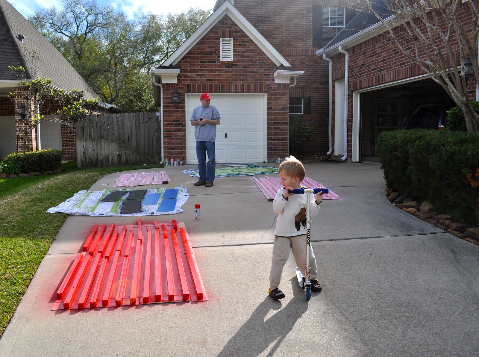 To transform four Kura beds into a wildflower garden (x2), a fire truck, and a police car, we first had to spray paint them. For hours on the driveway. M’s legs and brain cells may never recover. Neither will our driveway.