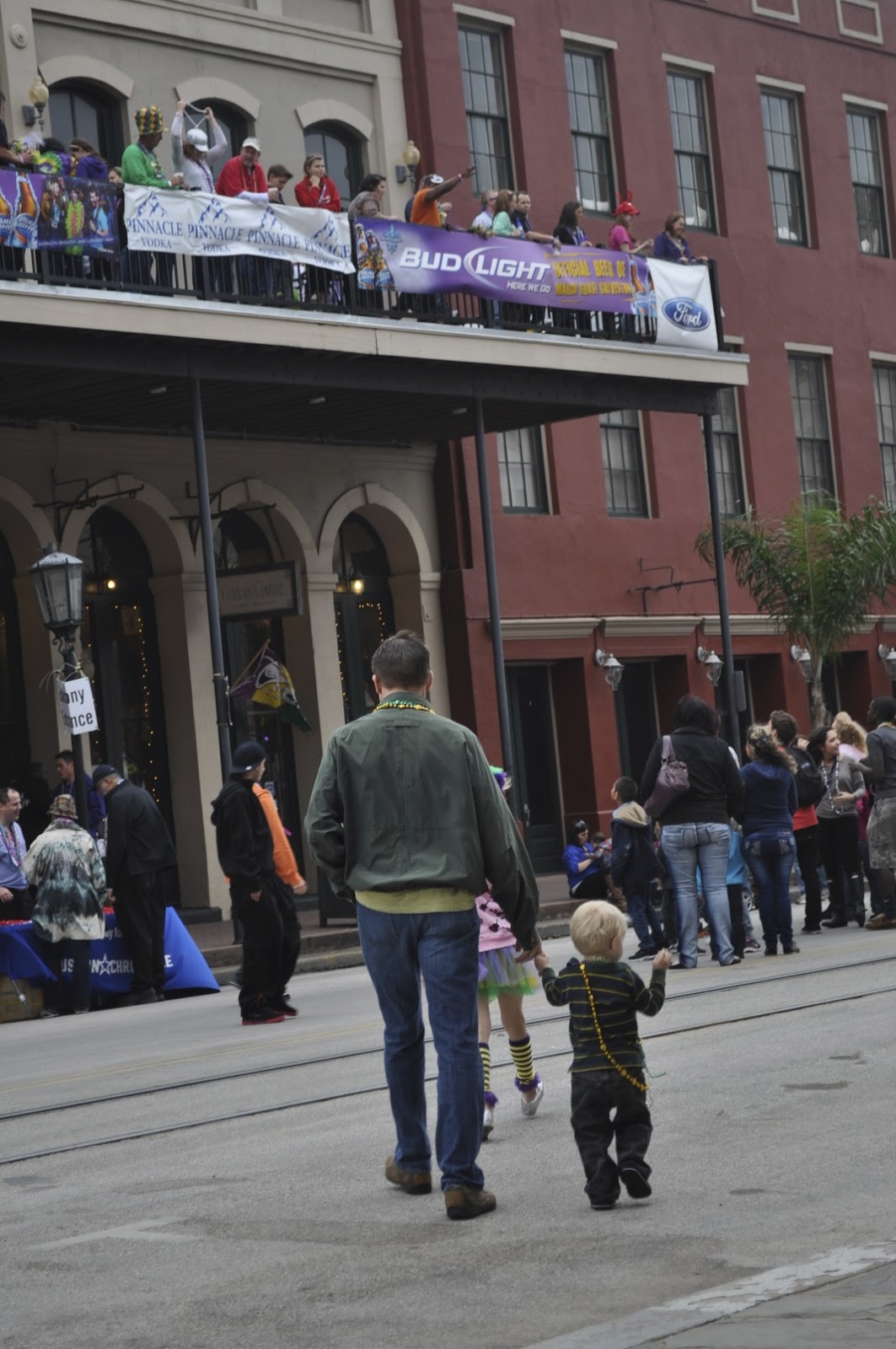 Our other little boy also enjoyed Mardi Gras in the best way he knows how: attached to his Goggy. Those people up on the balcony are about to throw some serious beads to that cute two-year-old. Love.