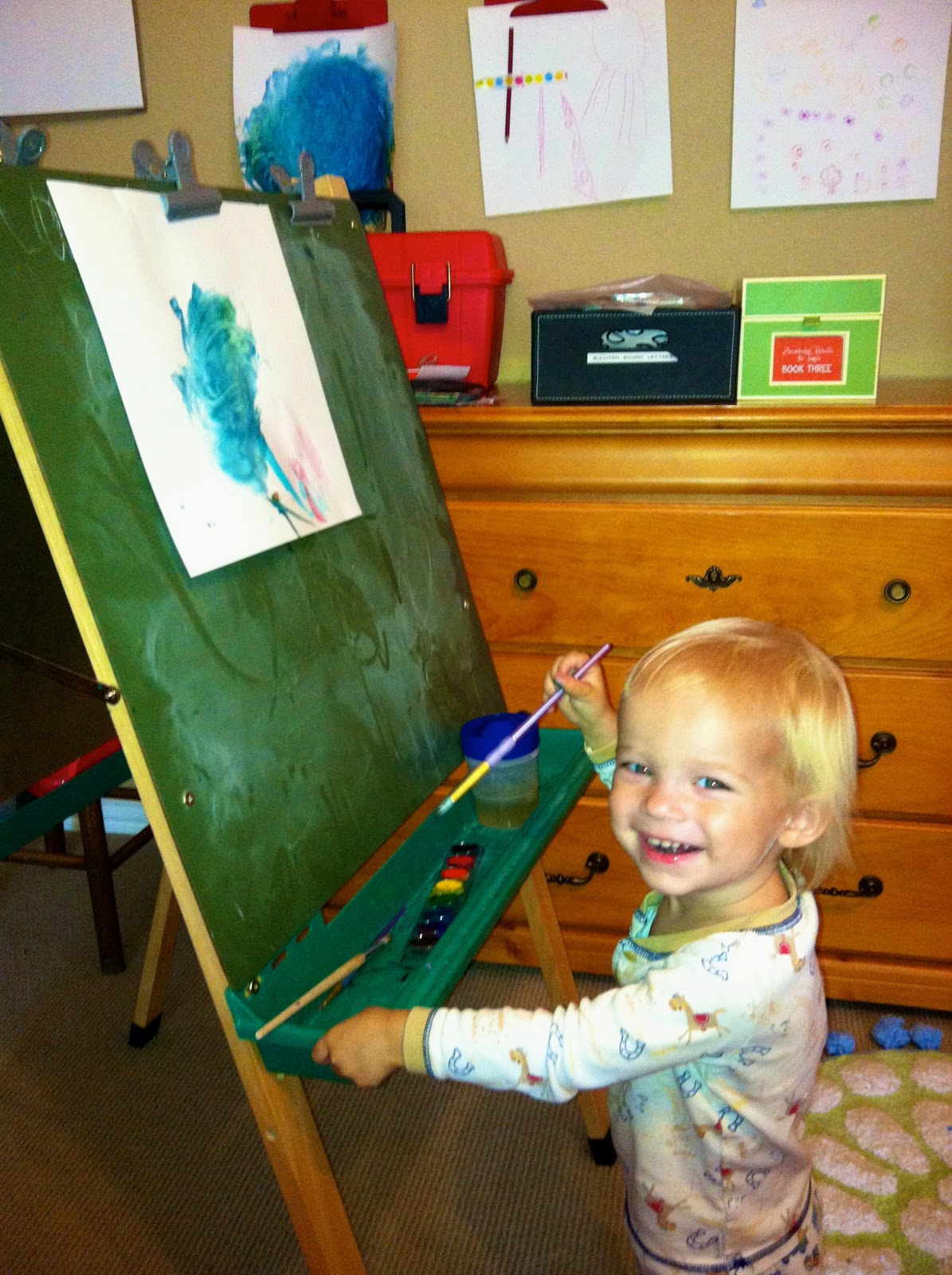 The paper is actually important, since it seems that when Catie used the easel five years ago, we didn’t give her paper (????). I would love to say that we’ve learned some things in those five years, but that would not explain why one-year-old Nate is painting without a smock.