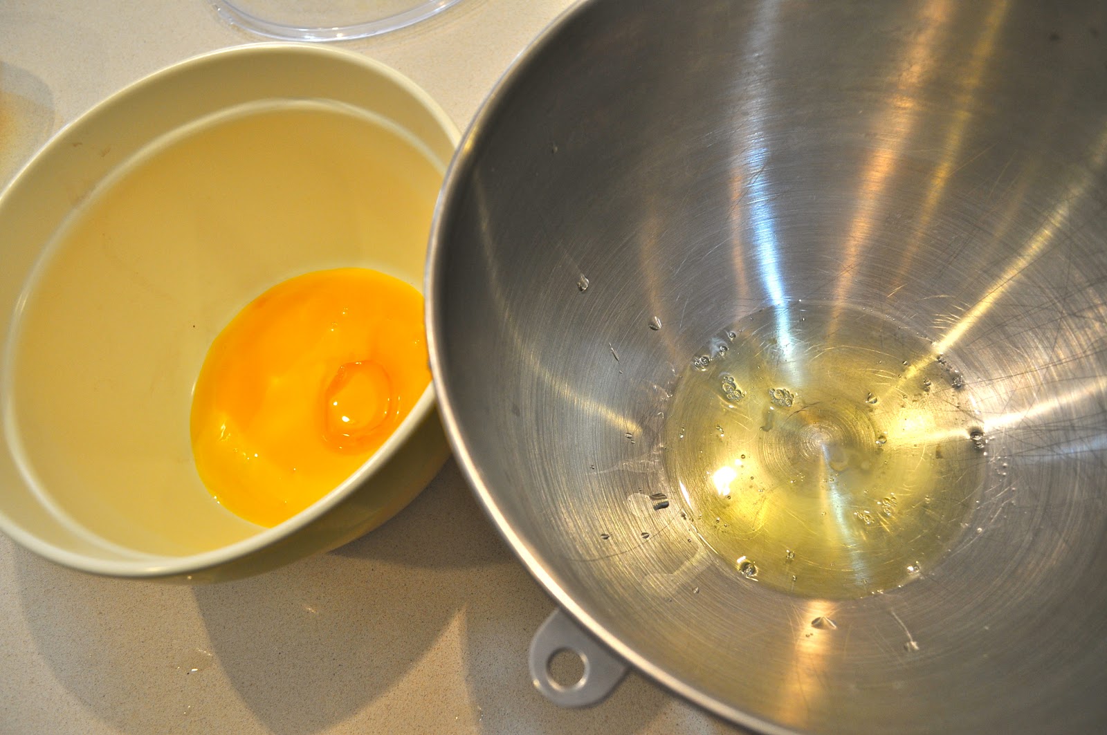 Separate the eggs. Place the whites in a mixing bowl and the yolks in another.