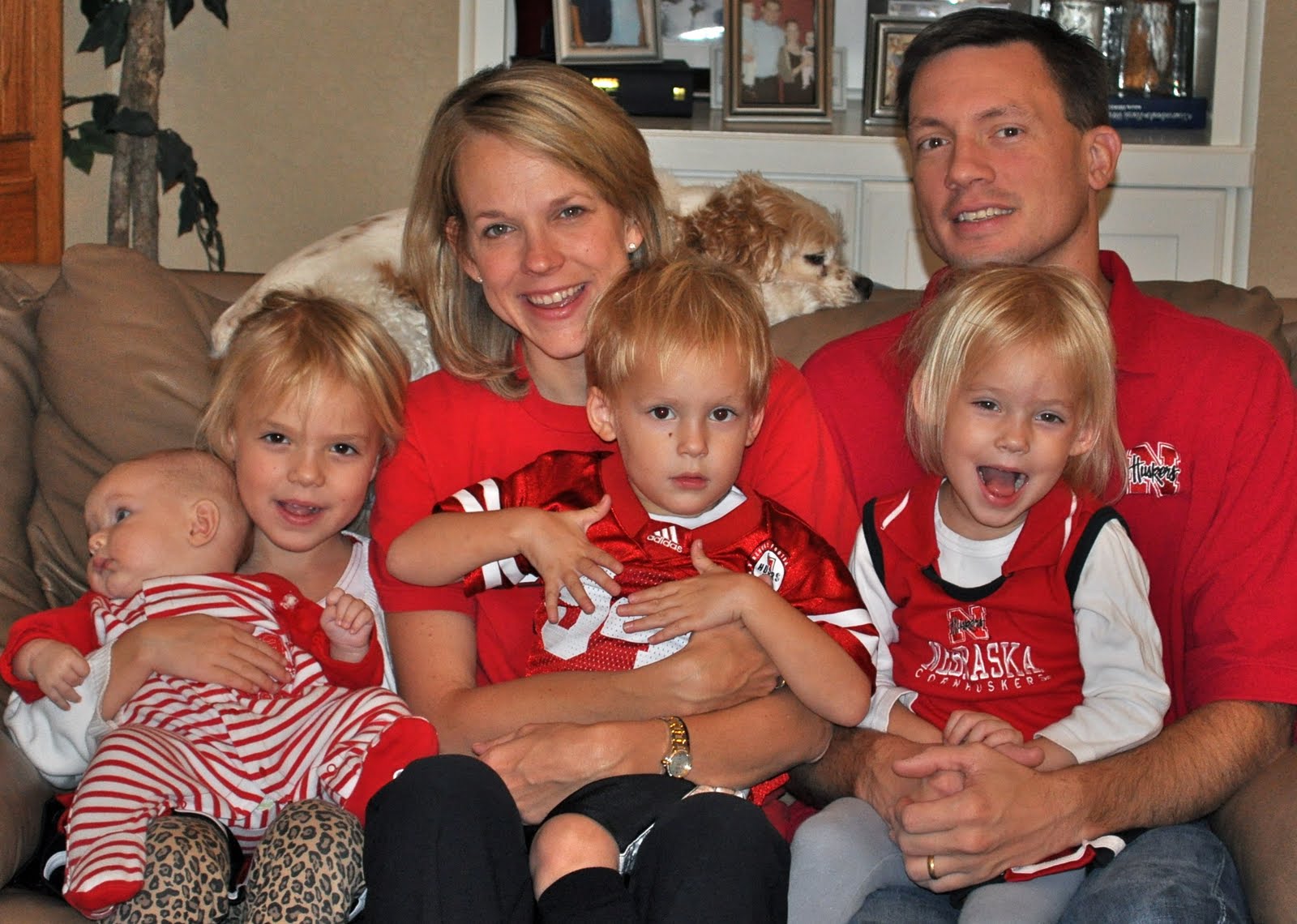 Also different from the other picture is that we’ve swapped Santa for Maddie, our dog. Maddie turned nine last week. Which means she has been with M. and me through a lot. She was our first baby. She has lived with us at all three of our houses. She has curled underneath my desk while I’ve written ten books and countless hours of Bible studies. She has welcomed four babies home from the hospital.