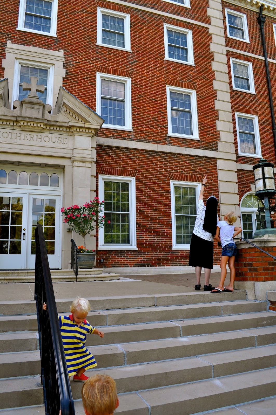 This trip we had extra time to do things like take tours of nuns’ residence. And the kids truly enjoyed it. Catie especially is intrigued by all things nun (what vows Sister took, why, who becomes a nun and how the sisters live). In this picture, Sister is showing Catie a different perspective of the Motherhouse–where her outside window is.