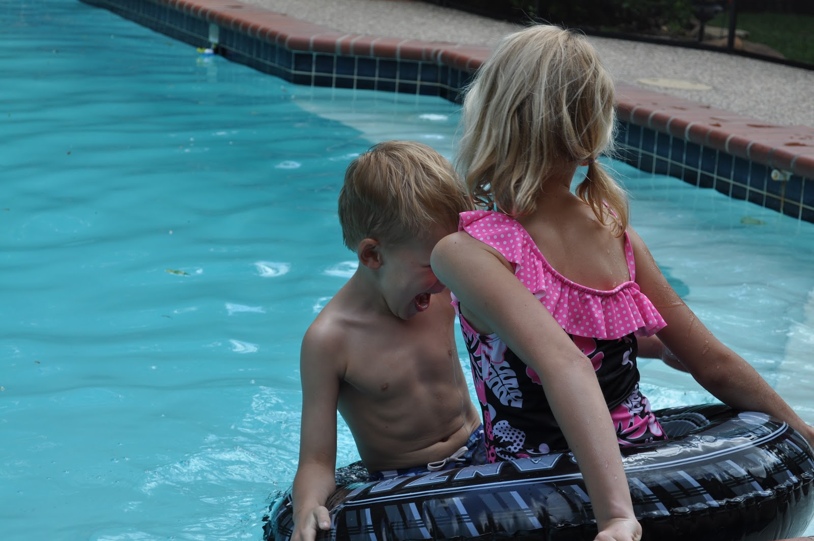 This summer, we will spend almost every day in our swimming pool. By August, the pool will become so routine, the kids won’t even think about the fact THEY ARE IN THE SWIMMING POOL! They’ll barely scream and carry on about it. The pool will be as much a part of our day as staying in our pjs until noon. But now? In April? Yeah. The pool is a frantic place, full of LOTS of screaming and carrying-on.