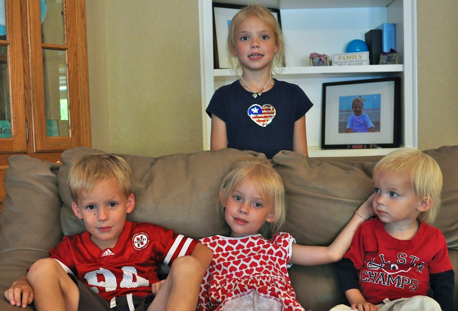 These kids are all gathered on the couch because we’re having summer school! They’re learning to write their names (twins). They’re learning multiplication (Catie). They’re learning not to hit their mother (Nate).