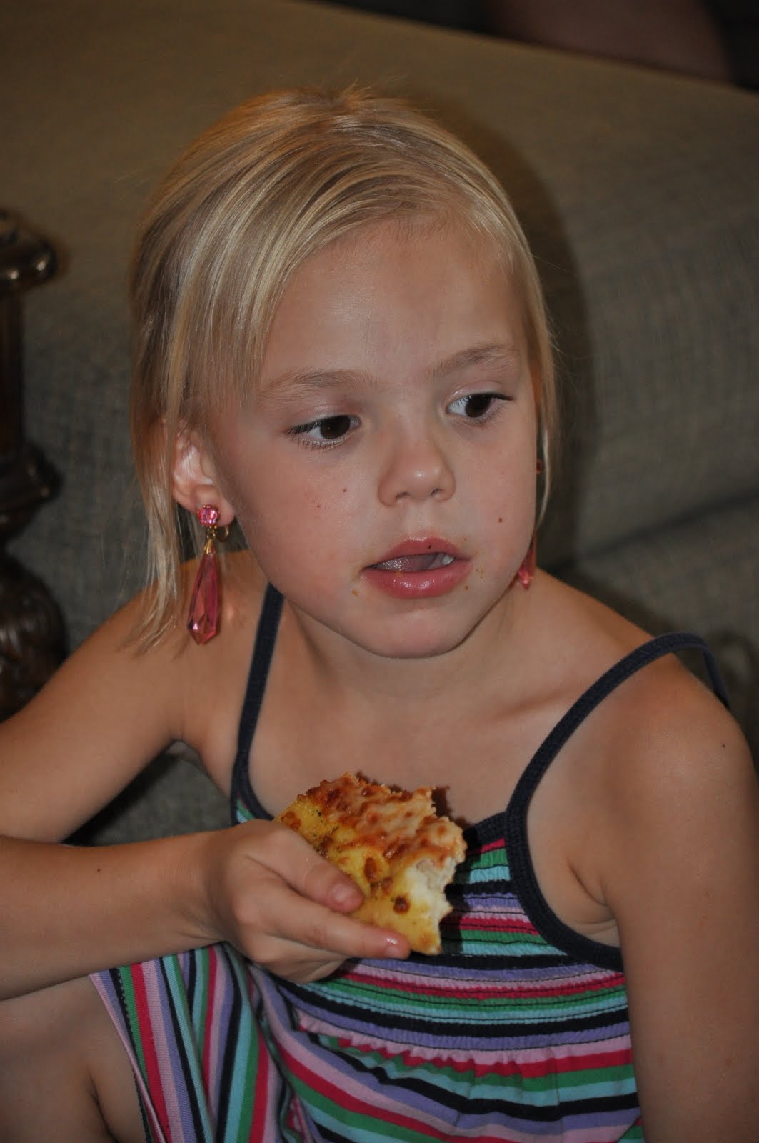Second, this picture of her chowing down on pizza was taken at a friend’s birthday party, not in her new cafeteria. (See? The earrings are Birthday-Party Festive, not School Serious.)