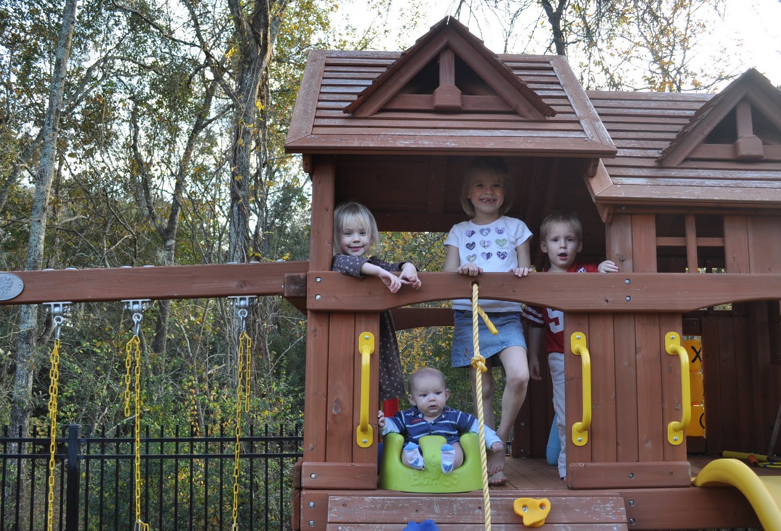This picture was my Christmas present from M. and the kids. In a homemade frame. Perfect. They know my love language is pictures. And spent the day getting this shot of all four kids smiling. Or at least looking in the same direction and not falling off the playset.