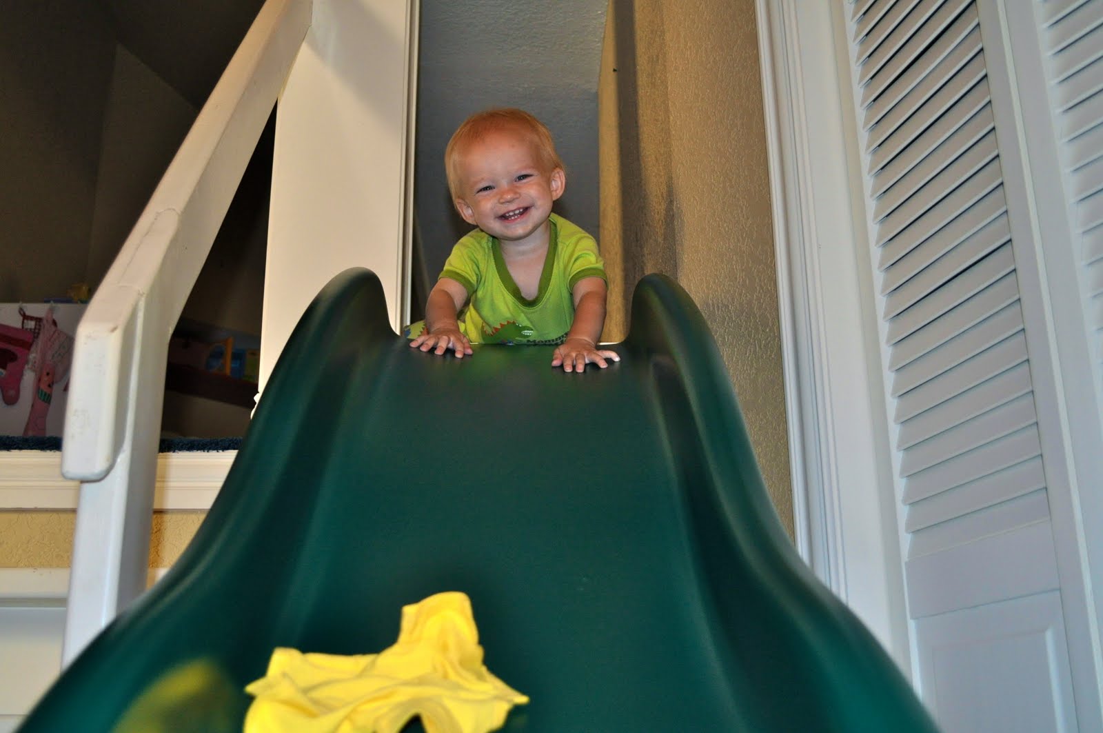 (with appropriate picture of the new SLIDE in our playroom. An indoor slide? Definite UP. Even though Nate is afraid to go DOWN solo.)