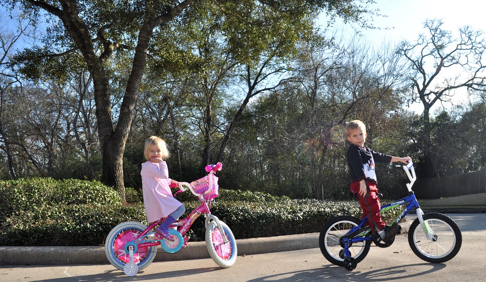 Sam and Ellie got new bikes this week. Actually, Sam got a new one, and Ellie got Catie’s old one. Part of being the second girl–all the nail polish you can imagine, but also an old bike. Sam his (literally!) riding circles around Ellie. She is too busy a) readjusting her baby doll in its basket b) fixing her gold sparkly-yellow flannel outfit or c) trying to figure out how to ride the darn thing.